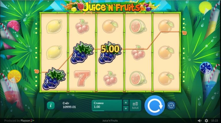 Juice Fruits автомат располагает пятью игровыми барабанами и тремя линиями символов. В нем 10 фиксированных выигрышных линий, комбинации по которым засчитываются слева направо, начиная от трех совпадений.