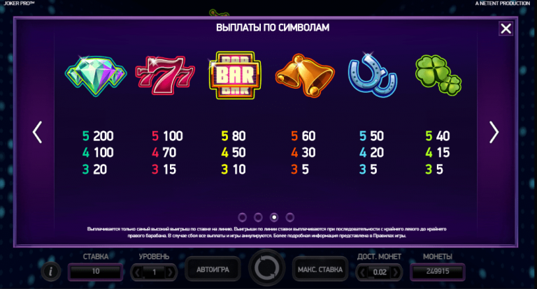 Те, кто знаком с продукцией NetEnt наверняка удивятся, что в Джокер Про активны все 10 линий выплат, а отдача автомата составляет 96,8%, что является довольно высоким показателем. Джекпот игрового автомата — х1000.