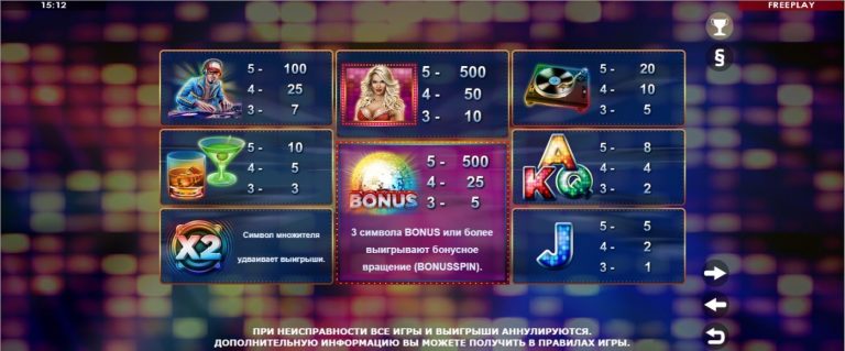 Слот Party Night предлагает вам отправиться в мир популярной музыки и дискотек. Вращайте барабаны, собирайте спецсимволы и выигрывайте солидные призы, как при основной игре, так и в ходе бонусных раундов в казино Слот В.